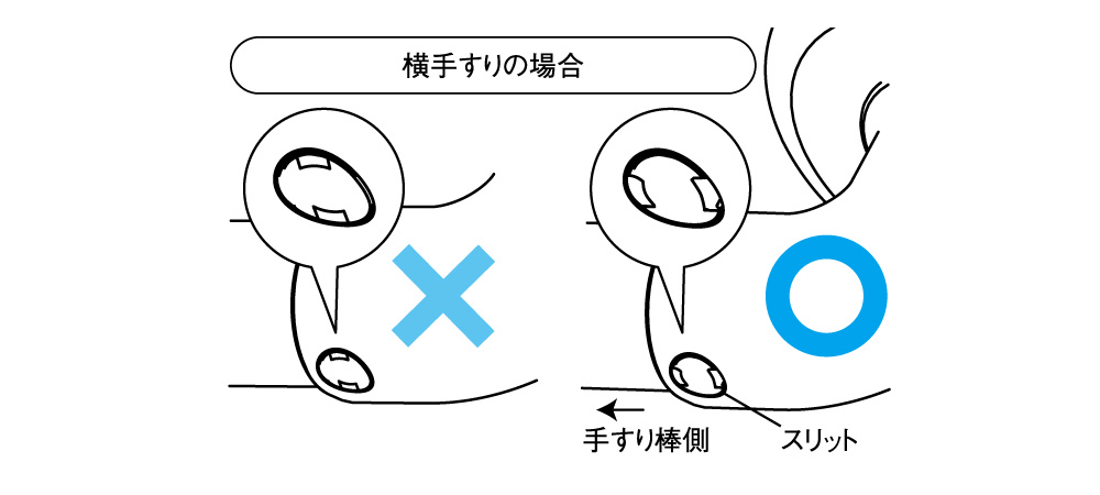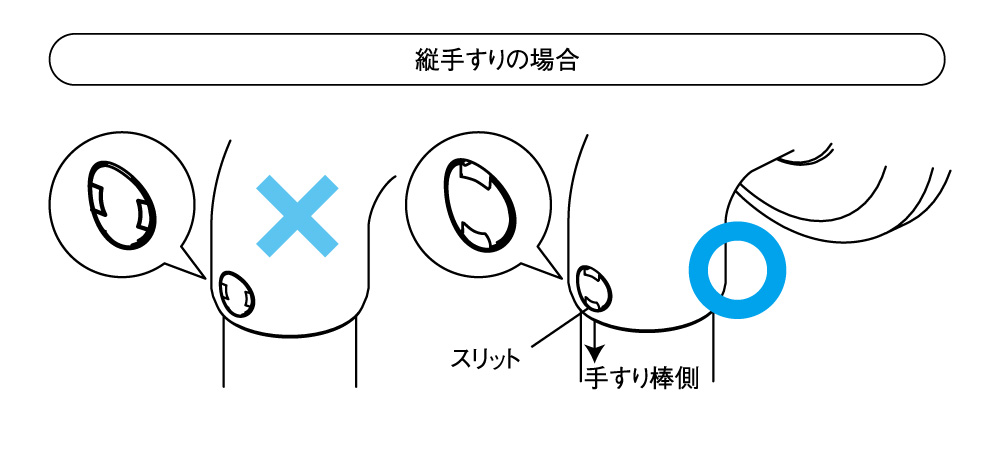 ねじキャップのスリットが手すり棒側にくるように取付けないとはずれてしまいます。