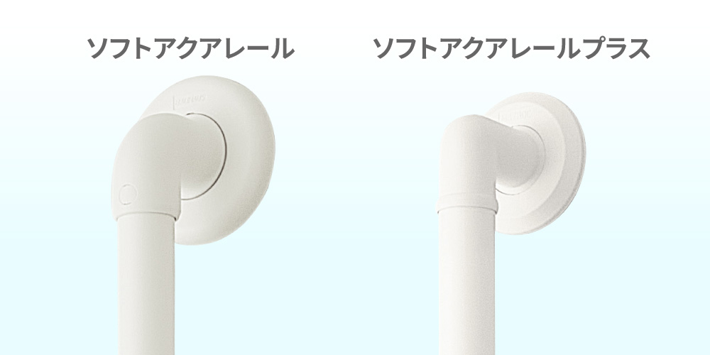 ソフトアクアレールのブラケットは一部を除き全て樹脂製ですが、プラスの方はブラケット台座にステンレスを使用することで強度を担保してサイズを小さくし、手すり棒のみ込み部分のラインを整えるなどデザインもスッキリさせました。